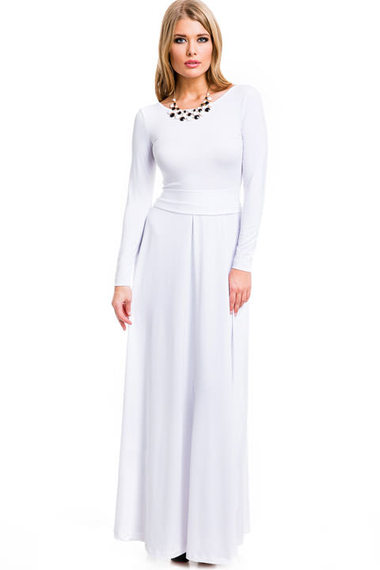 Модное в этом сезоне белое летнее платье в пол с длинным рукавом. Спина у платья закрытая.
