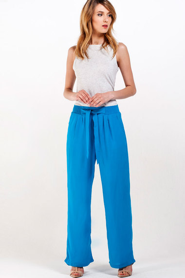 ОписаниеЯркие летние брюки из легкой ткани бирбзового цвета. Модель с карманами, штанинами на завязках и поясом-резинкой.